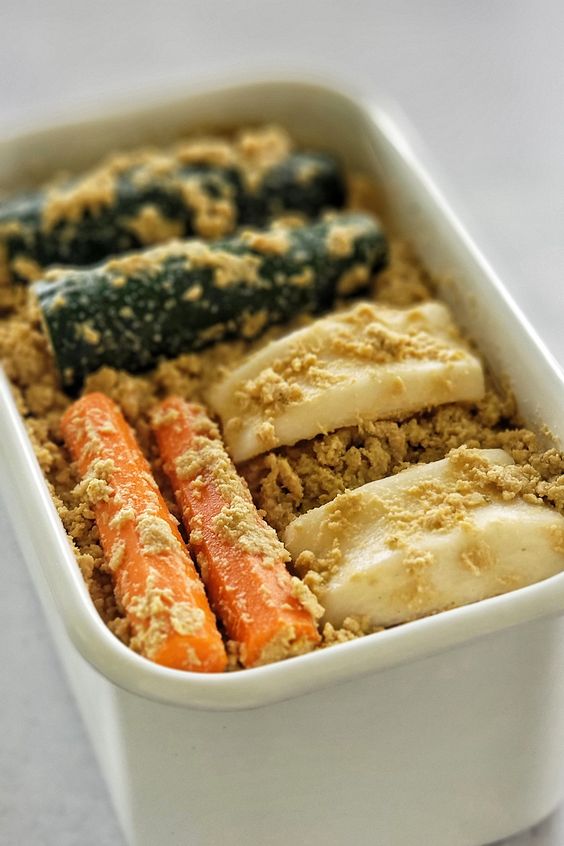 Нукадзукэ (цукемоно) – это обычные домашние соленья, заквашенные в смеси из обжаренных рисовых отрубей (нука), соли и других ингредиентов. Целые овощи – чаще всего огурцы и дайкон – размешивают в этой смеси и оставляют для заквашивания на срок от одного дня до нескольких месяцев. Получившиеся хрустящие, соленые и терпкие огурчики затем промывают, нарезают и подают на стол. Нукадзукэ богаты лактобактериями и, как говорят, помогают пищеварению.- Рисовый хлеб (комэпан)