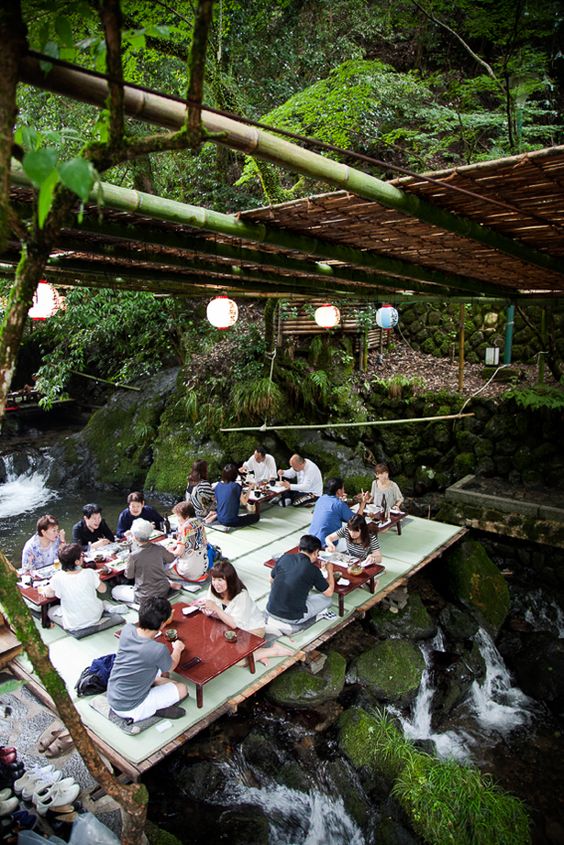 Обеды на террасе очень популярны, особенно вдоль реки Камогава по вечерам в выходные и праздничные дни.