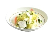 Хакусай но сокусэкидзукэ – это быстрое и простое блюдо из малосольной капусты хакусай, которую часто смешивают с морковью и огурцом и приправляют цедрой юдзу, конбу и перцем тогараси. В результате получается соленый, хрустящий огурчик со слегка пряным цитрусовым вкусом. Это один из самых распространенных видов солений в Японии.