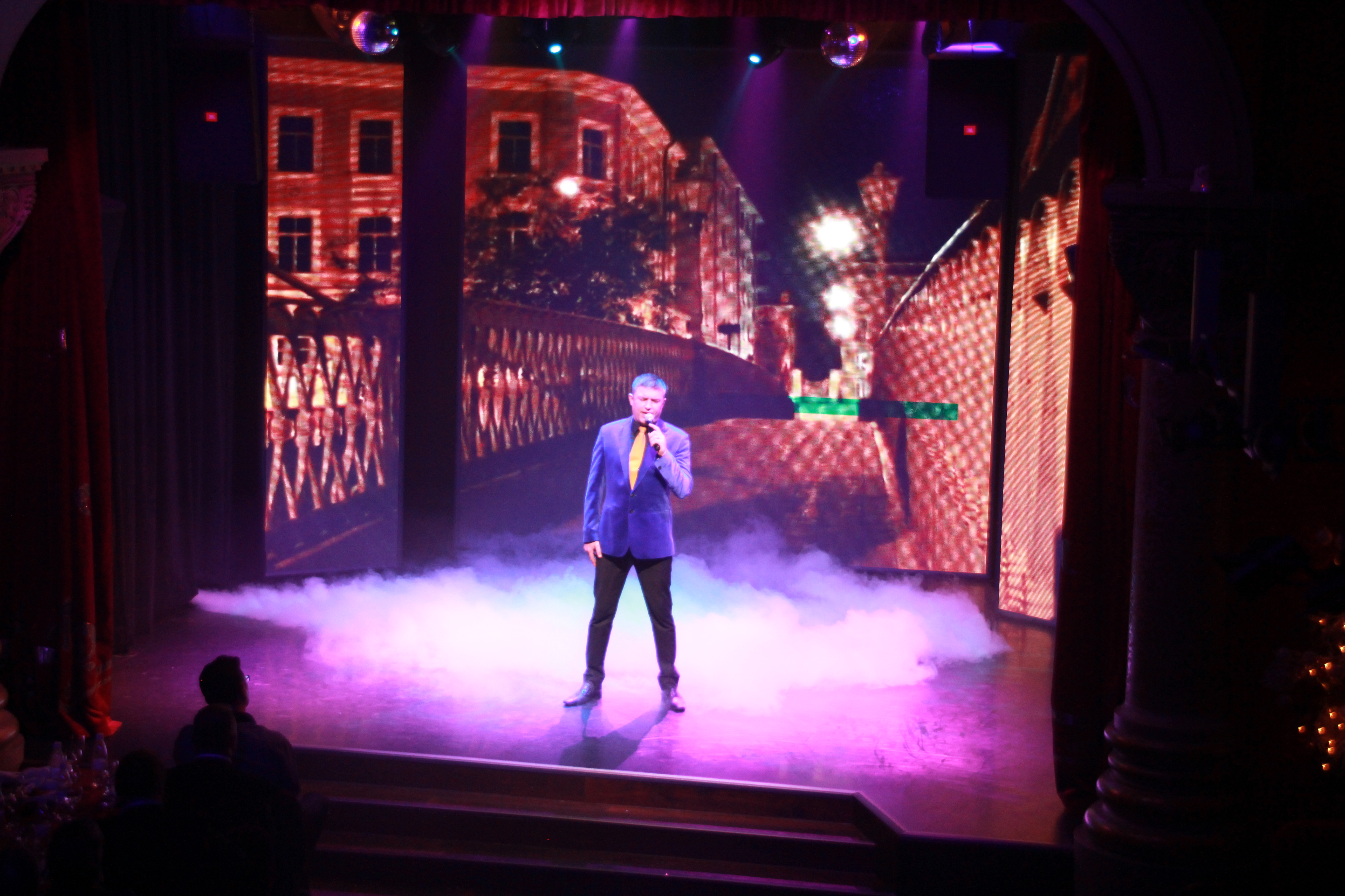 ロシアの歌謡曲はどことなく哀愁が漂うところがあり、賑やかな出し物の間に哀愁漂う歌謡曲の歌い手さんが登場します。バックも哀愁漂う感じで、これもロシア風演歌みたいな感じで面白かったです。背景は実際に橋があるわけではなく、映像です・・・。
