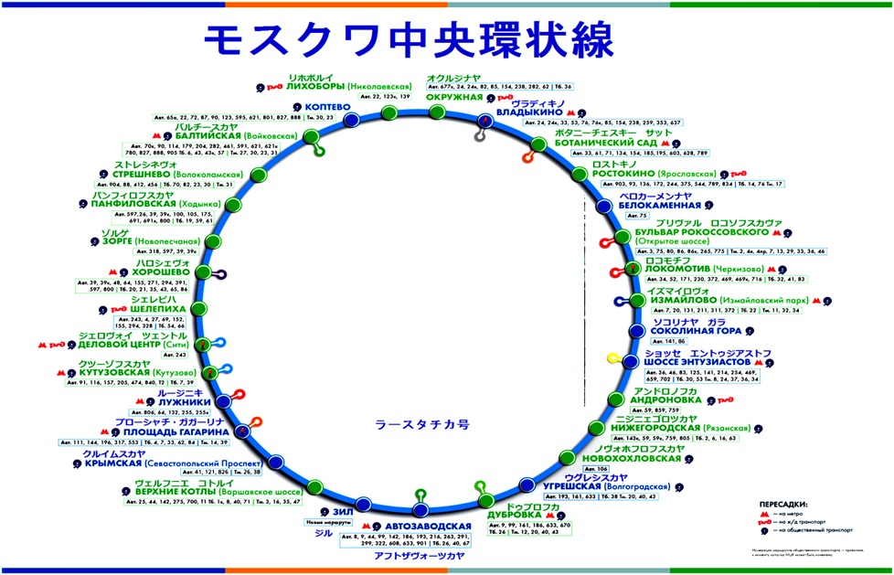 2016年9月10日にモスクワ中央環状線が開通しました。新環状線の総距離は54km、1,5時間で1周します。駅の数は31で、そのうち14の駅が地下鉄と接続します。運行は12分間隔、但し朝夕は6分間隔。運行は地下鉄と同様朝6時前から午前1時前まで。車両内にはトイレもあります。バリアフリーになっている駅も多いです。日本人観光客が良く利用するヴェガ・ホテルの近くにイズマイロボ駅ができたため、ヴェガホテルからの観光地へのアクセスも良くなりました。たとえばノヴォデヴィチ修道院へはルージニキ駅で降りれば乗り換えなしで行けるようになりました。モスクワ・シティもジェロヴォイ・ツエントル駅でおりれば1本です。全線1回50ルーブル。 (2016年11月作成)