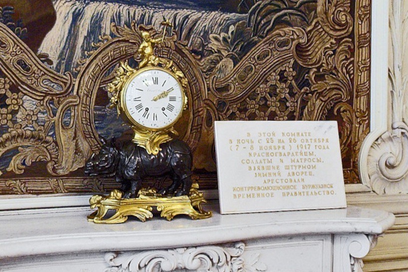 エルミタ-ジュ美術館の小食堂には止まった時計があがります。これは100年前の1917年11月7日から8日の夜10月革命時に止まった時計です。
