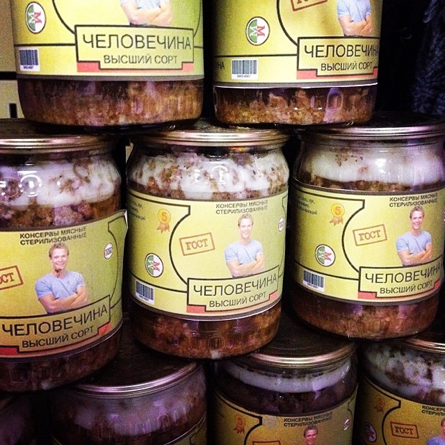 写真は生々しい人肉の瓶詰。「гост」規格、「人肉特上品」と表記されています。