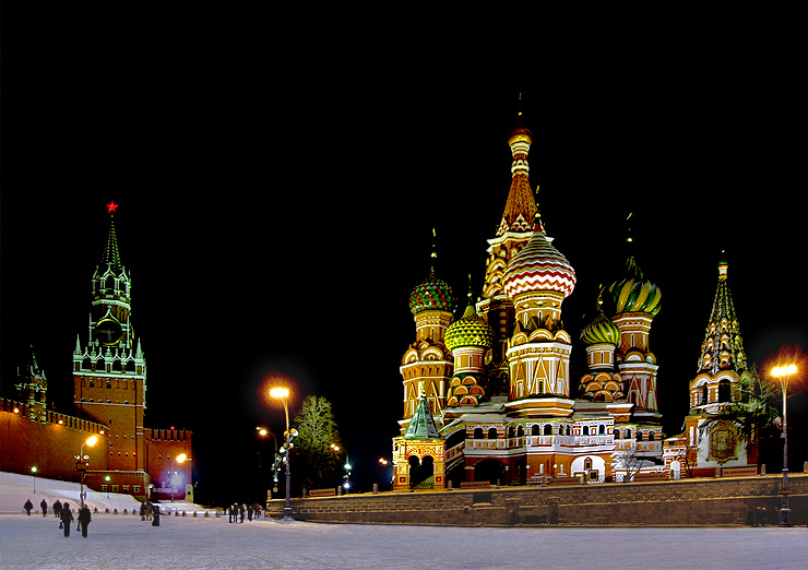 モスクワの冬は、ライトアップがとてもきれいです。赤の広場、ワシーリー寺院のライトアップはこんな感じです。