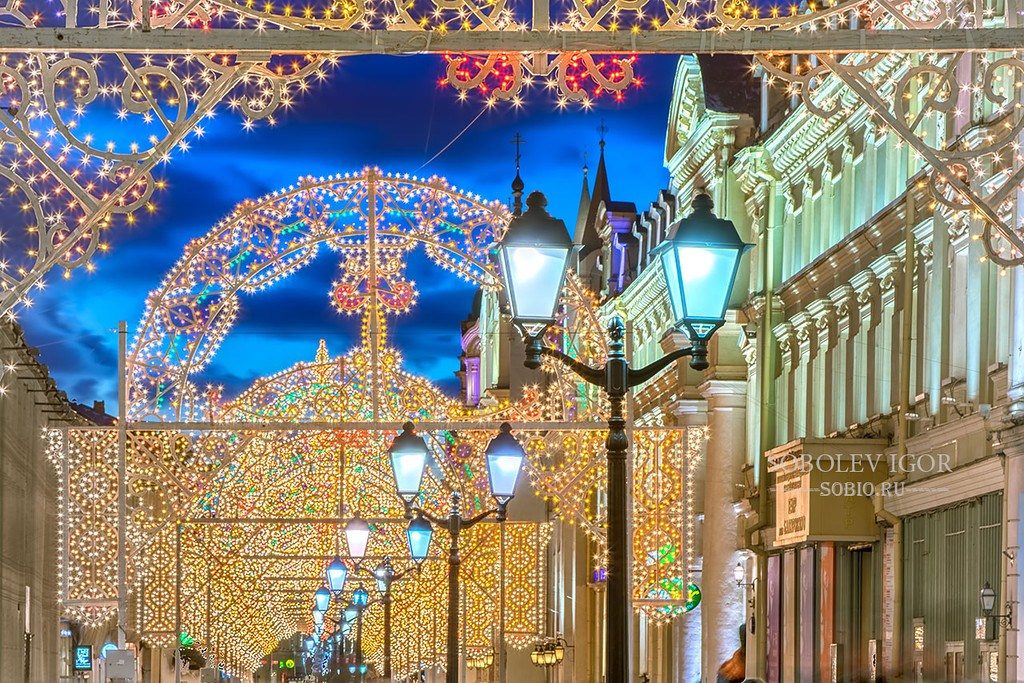 モスクワの赤の広場からルビャンカに抜けるニコリスカヤ通りのイルミネーションです。とてもきれいです。この通りにはおしゃれなカフェやお店がたくさんあります。チョコレートの名店アリョンカもこの通りにあります。