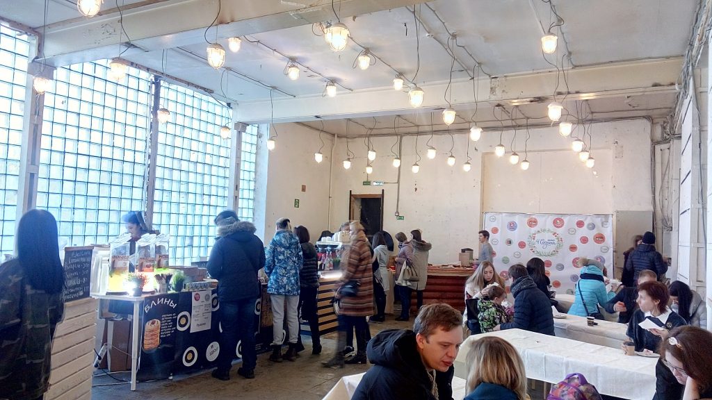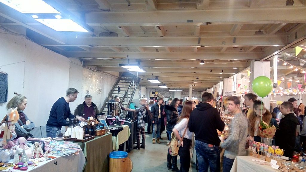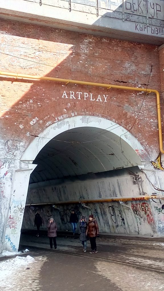 ARTPLAY アートプレイ は 、若者に人気のショッピングセンター『アトリウム』がある地下鉄クールスカヤ駅から、徒歩10分です。大通りから左に曲がると、古いトンネルがあり、「あれ、間違えたかな・・・?」と思ったところで、トンネルに『ARTPLAY』の文字が。トンネルをくぐりぬけると、道を挟んで左右に渡り全体がARTPLAYの敷地です。今回マーケットが行われている会場は、右側敷地内の小ホール。