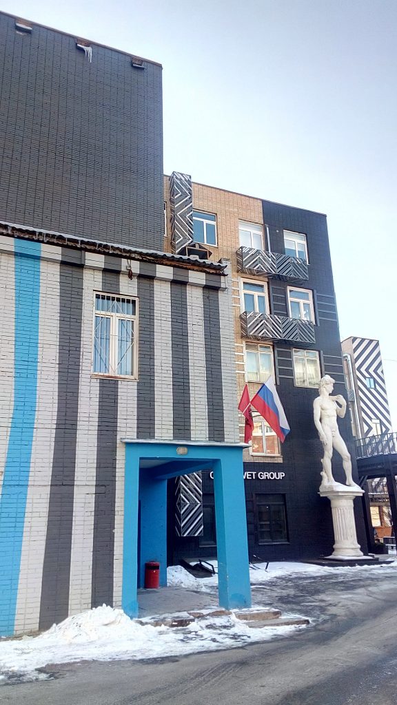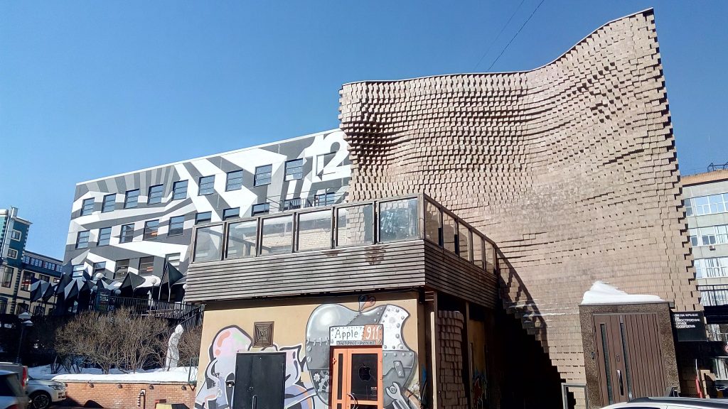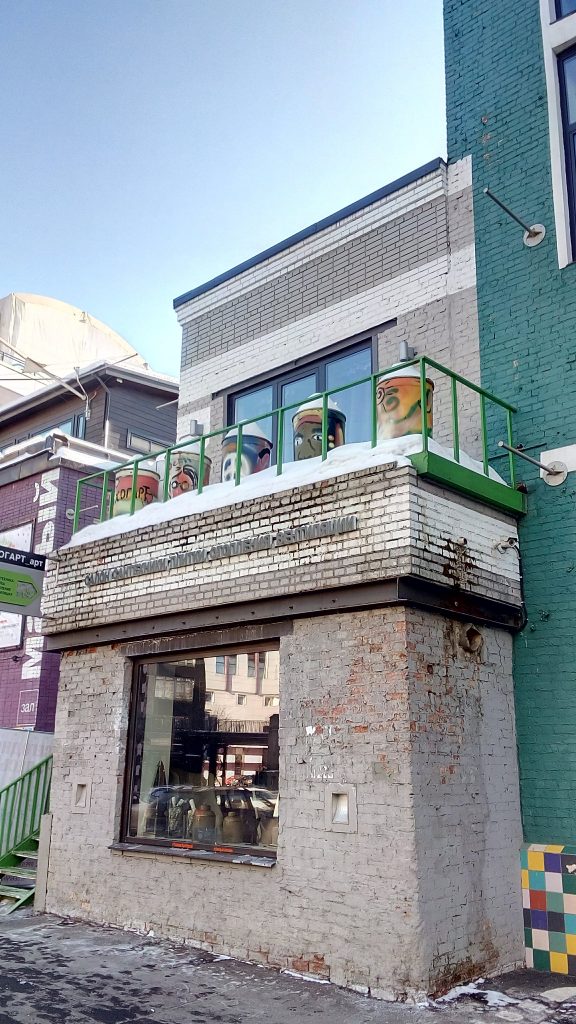 落書き風のウォールペイントも、ここの建物には不思議とマッチして、面白さがあります。右側の顔のモザイクはロシアで有名な、古いコメディ映画の登場人物です。