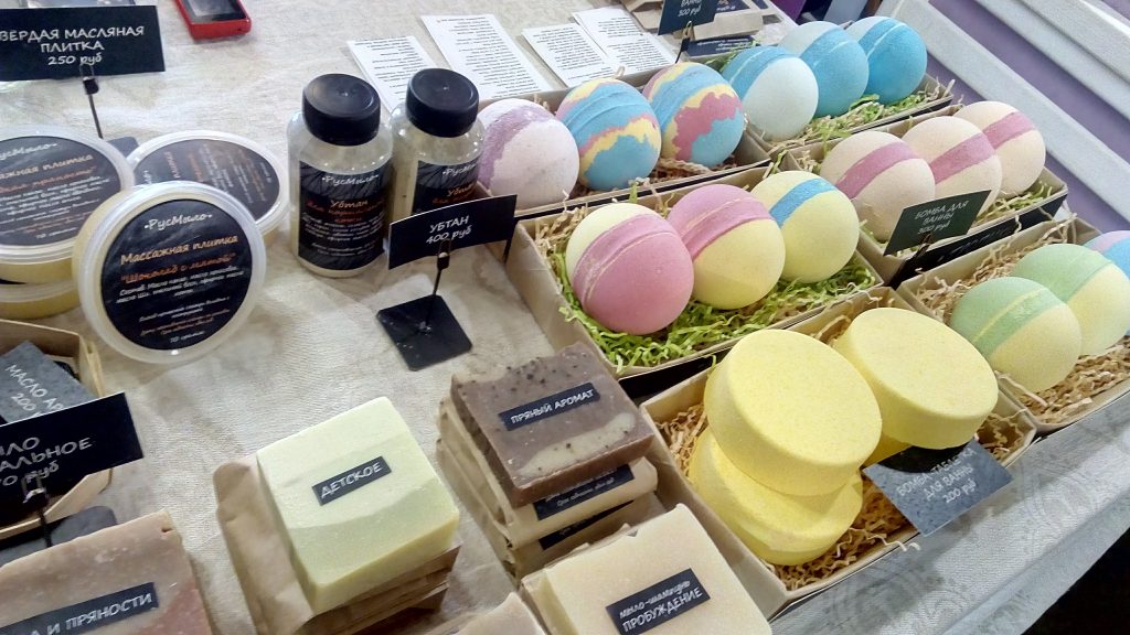 手作り石鹸のお店。オイルやバスソルト、入浴剤もカラフルで見た目も楽しいですね。