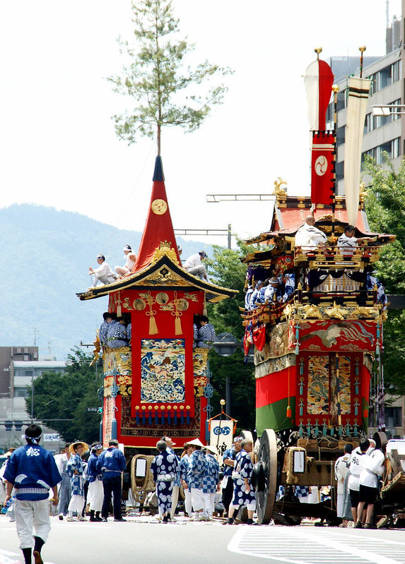 - Огромные колесницы “яма” (山) и “боко” (鉾) высотой до 25 метров и весом до 12 тонн проезжают по улицам Киото.